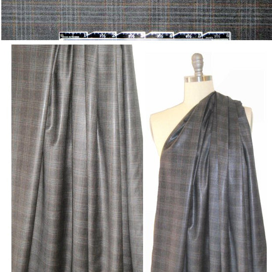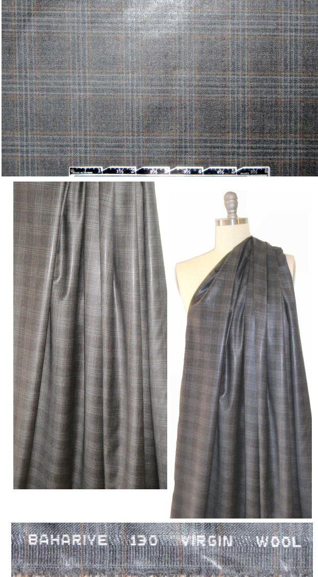 From the Turkish mill Bahariye, this is a fantastic quality virgin wool yarn dyed plaid (1.75" repeat) in a deep mix of off black, graphite and mocha (PANTONE 17-4402, 17-1319, 198-0306-ish). The face has a semi-glossy sheen (not sure how it's achieved--it is so well integrated into the fabric it does not seem like a coating or lamination), and the reverse has a matte finish. It's an exquisite, classic and refined wool, perfect for suiting, tailored jacket, slacks, dress, skirt, etc. A wrinkle resistant, lighter weight suiting with nice drape that has some body. Dry clean only. 2 yds.