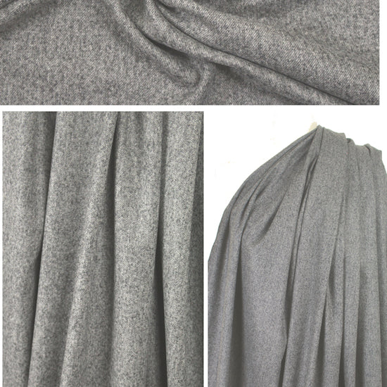This beautiful Italian wool/nylon twill from Tahari is classic and sophisticated, wonderful quality, and a versatile weight. It is a tweedy twill weave in light gray and dark gray (PANTONE 14-4002, 18-4005...ish), and it an opaque, lighter suiting weight with a soft drape. Perfect for tailored looks with drapey details, jacket, skirt, dress, slacks, etc. Dry cleaning recommended.
