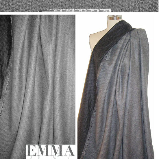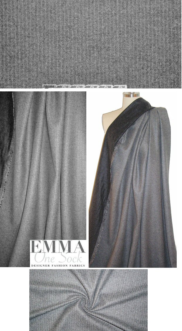 This STUNNING Italian wool woven from Mi11y is a double-sided coating weight with a herringbone weave (on the face) and a super soft hand. It is a charcoal gray and winter white herringbone on the face, and an off-black with a subtle stripey look on the reverse. It's a perfect winter coating weight, substantial with a more firm yet malleable drape. Much more amazing in real life! Make a fabulous jacket or coat. Dry cleaning recommended. LAST PIECE, 2 yds.