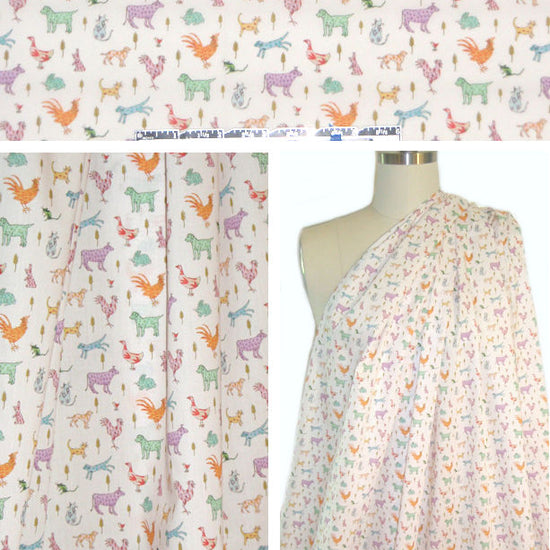 From the new Fall 2017 collection of Liberty Art Fabrics, this is a Tana lawn weight cotton print, imported from England. The print is called 'Farmyard Tails', and features a cute array of farmyard animals with pretty graphics (3" repeat) in tones of mint, citrus, lemon, purple, aqua, creamy white, etc. (PANTONE 14-6330, 15-3412, 14-0955, 12-5206, etc.). The cloth is an exquisite quality cotton lawn, lightweight, semi-opaque, soft with cottony drape, and the print has much more clarity and beauty in real life. (Some prints are directional, some of the drapey photos show the print upside down due to the way it comes off the roll.) For blouses, shirts, dresses, skirts, etc! Hand wash cold, hang to dry (please test first). LAST PIECE, 1.875 yds.