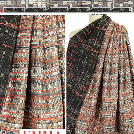 Just in with a shipment from French mills, this is a gorgeous tapestry jacquard brocade suiting, with a more firm yet malleable drape. The mosaic look pattern (32.75" repeat) features dark coral, medium gray, camel, off white and touches of gold metallic and sapphire lurex (PANTONE 16-1641, 18-5203, 16-1318, 19-4030, etc.). It's a heavier suiting weight, perfect for a fabulous structured jacket, topper coat, tapestry bag, etc. Dry cleaning is best. 2 yds.