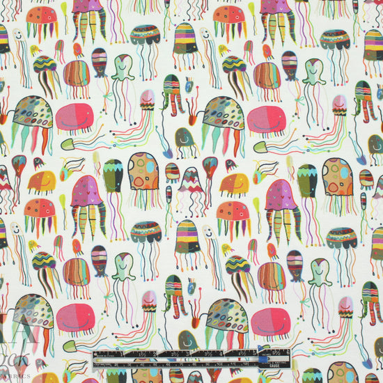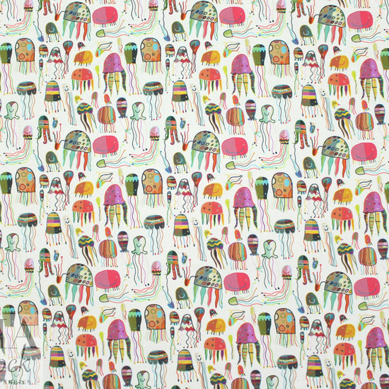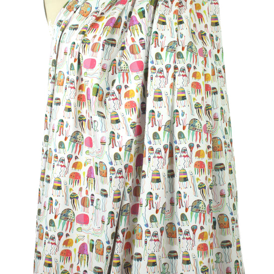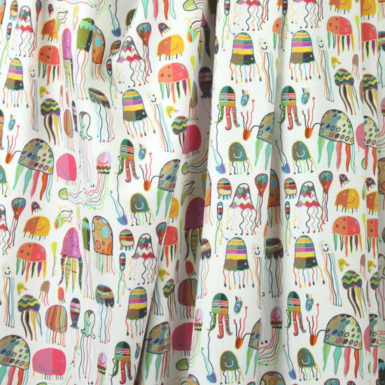 Here's another amazing cotton/lycra print imported from The Netherlands! First, the quality of the fabric is sublime, soft and substantial, with about 40% stretch in both directions. It is opaque and has a luscious hand and drape with body. The digital jellyfish print (6.25" repeat) is so wonderful, in gorgeous multicolor tones on a white background (PANTONE 15-5217, 16-1338, 12-0727, 16-4408, etc.). Make a fabulous tee, top, tunic, kidswear, skirt, dress, loungewear, etc. The manufacturer recommends hand or machine wash warm, hang to dry. Please test first.