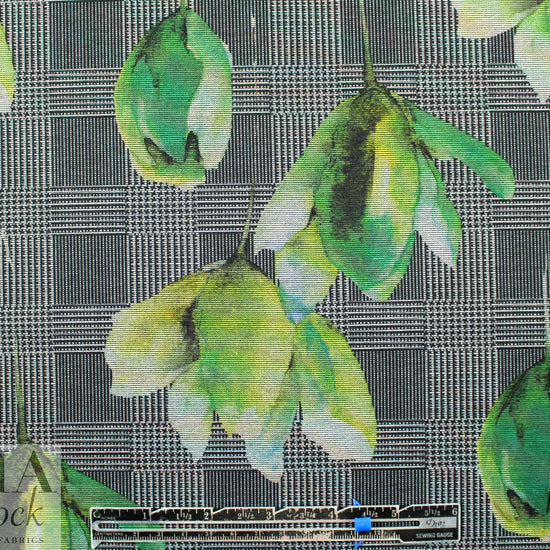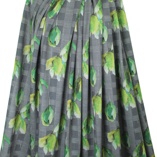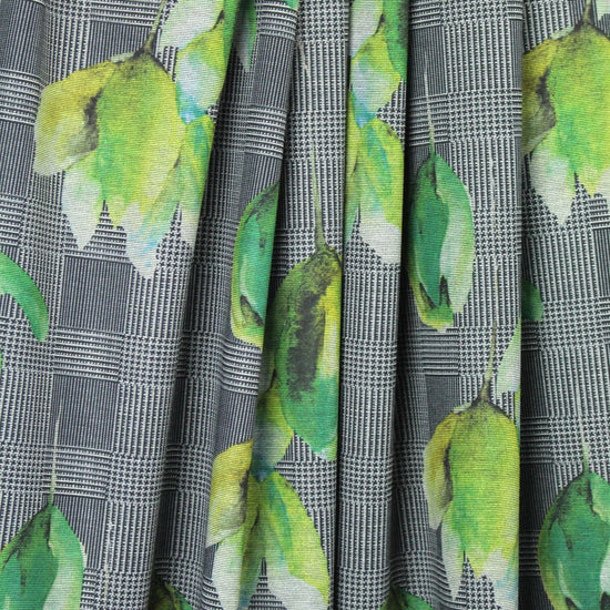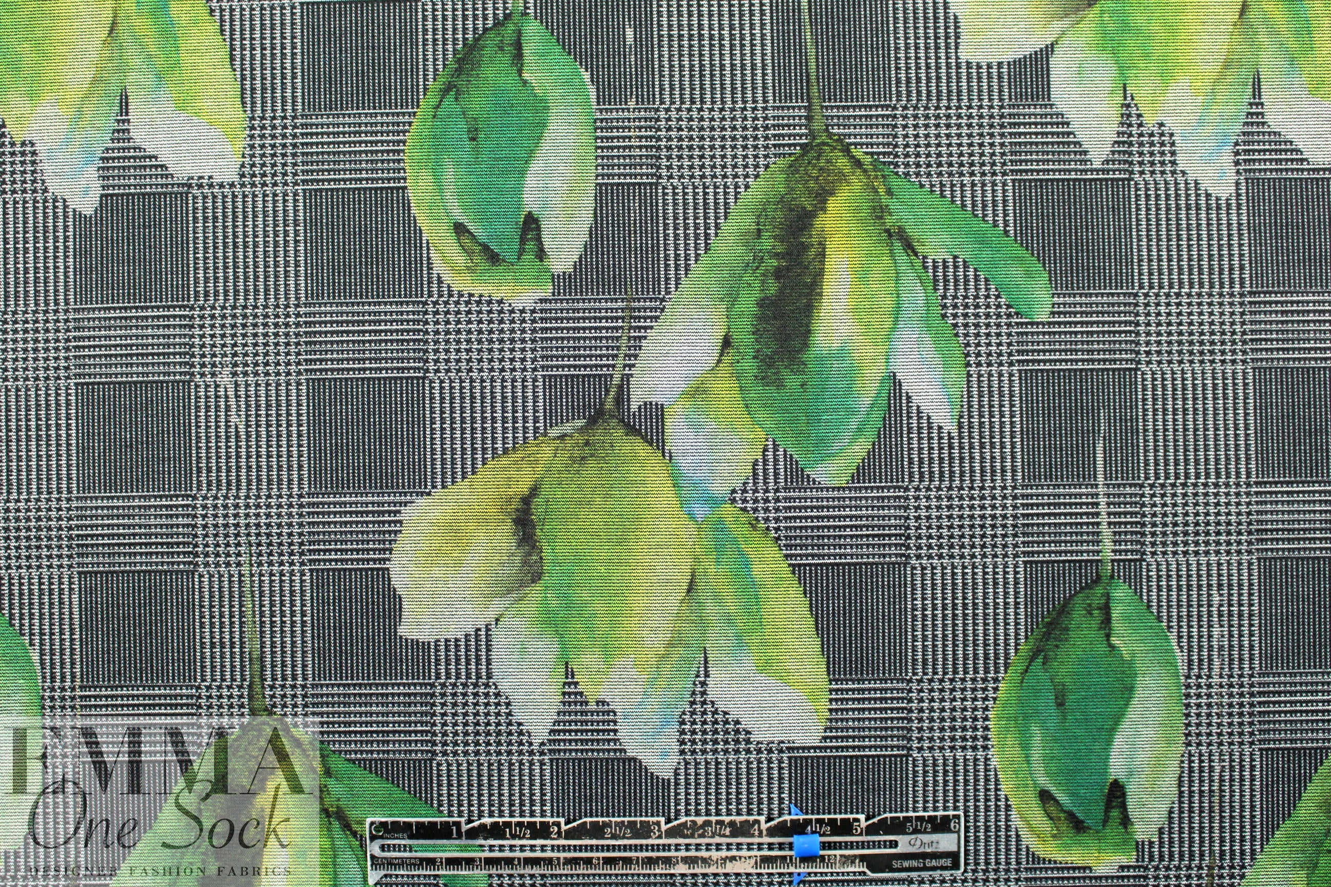 A new printed ponte! The base fabric is a beautiful quality black ponte, and the houndstooth check and flowers print (11.5" repeat) in shades of green, black and white (PANTONE 15-0523, 18-6320, etc.) is a one-way print that can be oriented with the flowers cascading downward, or point up towards the sky! This perfect medium weight ponte has about 35% stretch in the width, 15% in the length, with great recovery. There's no bleed through to the reverse side, so it makes an excellent solid contrast color! This fabric has lovely drape with substance and body, perfect for fashion-forward skinny pants, body hugging knit dress, tunic, skirt, knit suit, etc. Manufacturer recommends machine wash, tumble dry low, or dry clean. No bleach. LAST PIECE, 1.375 yds.