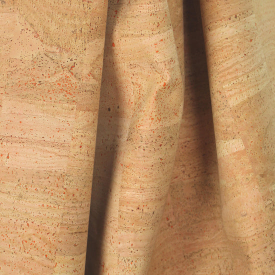 From a NY designer comes this cork fabric, perfect for sewing handbags, backpacks, purses, belts, sandals, wallets, etc. It is a natural product that is a sustainable, eco-friendly and green alternative to leather or faux leather. We have a small roll of it (12 yards), 56" wide, and will cut any length that you need. (If you want less than a yard, just order one yard and in the comments let us know how much you actually want and we'll make that adjustment before billing.) This particular color has a desert sand coloring with gem-like specks of bright orange and darker brown (PANTONE 16-1331, 16-1361). The fabric is slightly thicker than our faux leather, and has a firm drap, yet it is quite malleable and easy to work with for any number of accessories. VEGAN and PETA approved!