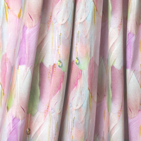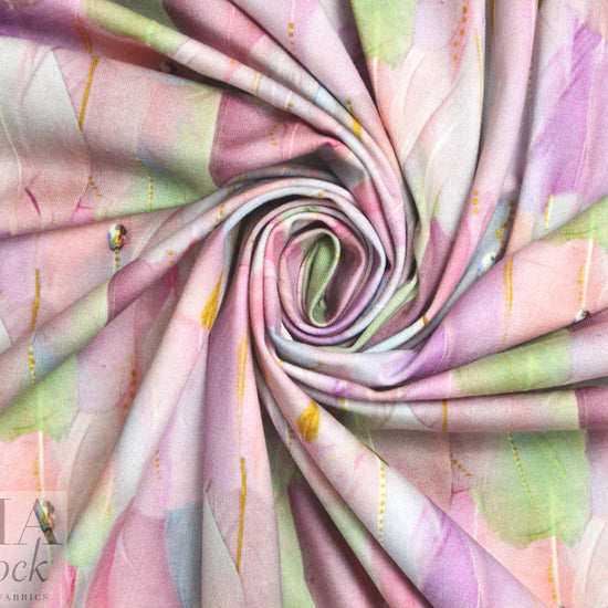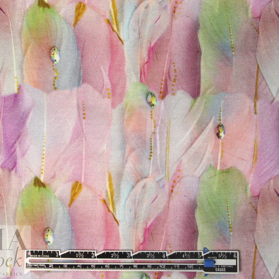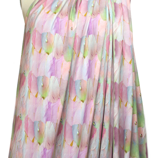 Here's another fabulous cotton/lycra print imported from The Netherlands! First, the quality of the fabric is sublime, soft and substantial, with about 60% stretch in both directions. It is opaque and has a luscious hand and drape with body. The fabulous "dreamcatcher feathers" print (5" repeat) features soft and mixed shades of pink, dusty blue, green, violet, etc. (PANTONE 14-2307, 14-4307, 13-0215, etc.). It's perfect for a fabulous tee, top, tunic, skirt, dress, etc. The manufacturer recommends hand or machine wash warm, hang to dry. Please test first.