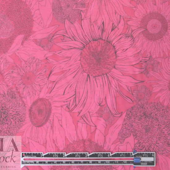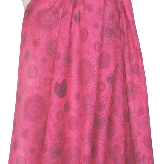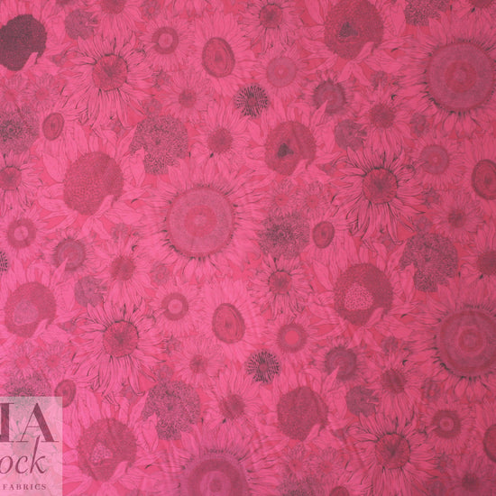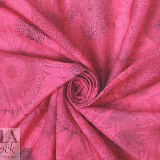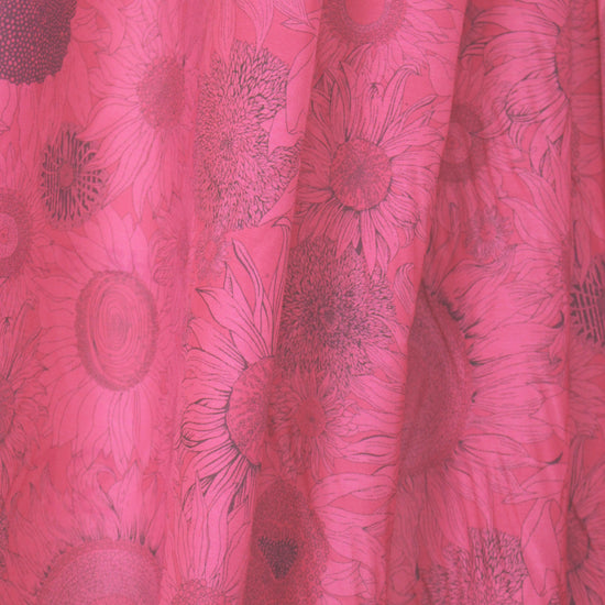 This came from a NY designer, but is a Liberty Art Fabric! It is a gorgeous sunflower print (24.5" repeat) on a floaty and semi-sheer silk/cotton voile. The colors are hot pink, pink rose and eggplant (PANTONE 17-2127, 18-2043, 19-3316). Make a beautiful blouse, shirt, tunic, dress, skirt, etc. Some styles will need lining or layering. Hand wash cold, hang to dry (please test first).