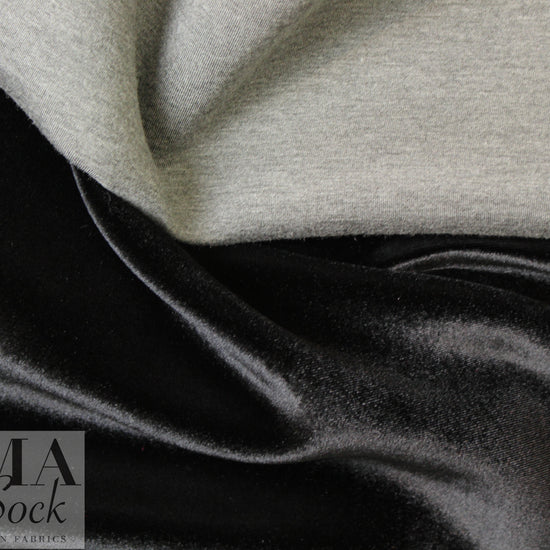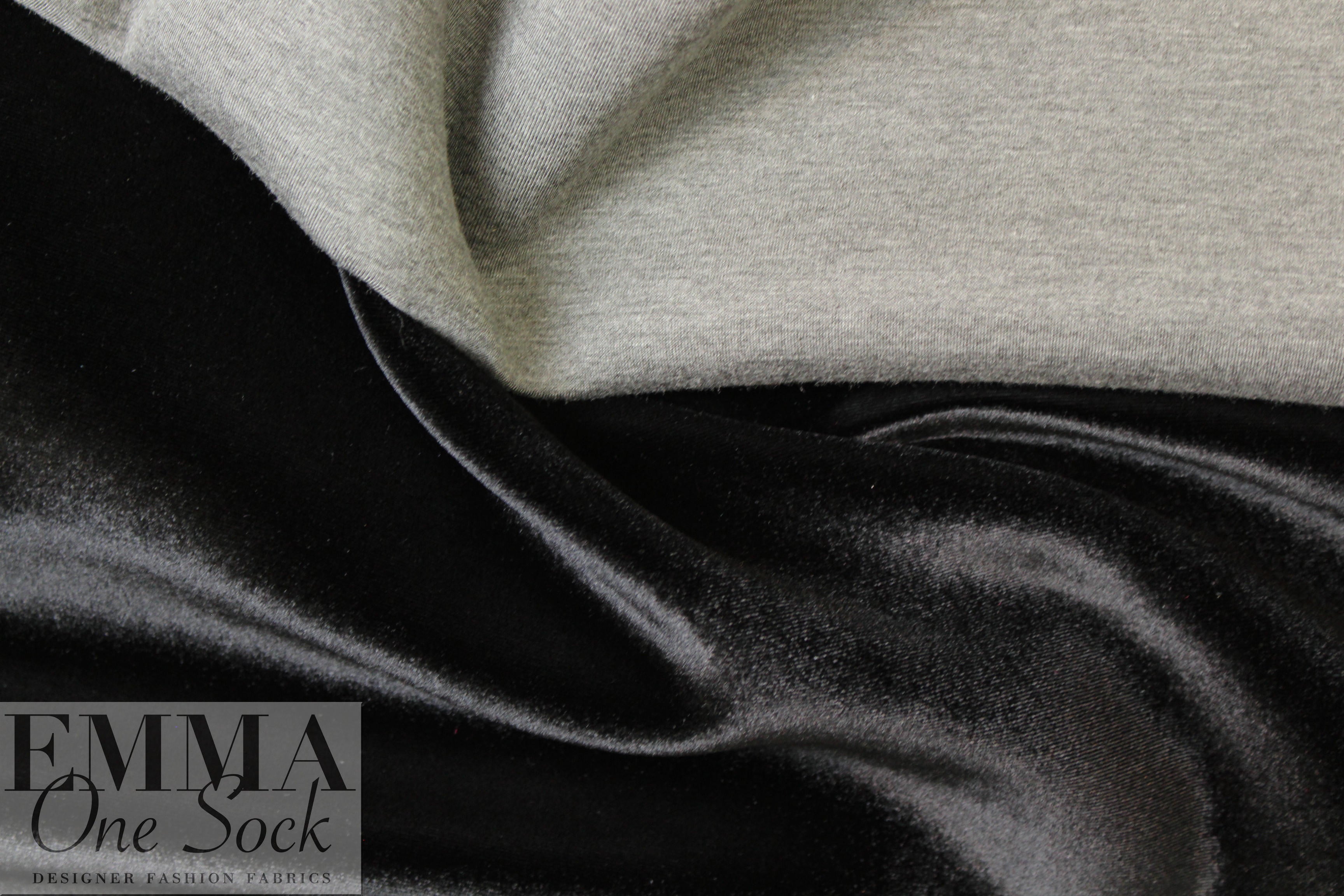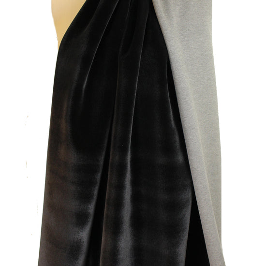 This is a fantastic and unique double cloth fabric from designer Vict0ria Hayes! It actually has three layers, with the top layer a plush and luxurious velvet, the middle layer a thin sponge to give it a "scuba"-like quality, and the bottom layer is a soft viscose jersey. The velvet layer separates perfectly from the other two layers which behave as one. It is a coat/jacket weight with about 20% stretch in the width, but it's very stable and won't stretch out. It is opaque with some body in the drape. The velvet color is black, and the back layer is a medium gray heather. What a fabulous, modern version of the Balenciaga coat this would make! Or, use for any luxurious coat or jacket pattern. Dry cleaning is probably best, although it's worth experimenting to see if it can be machine washed.