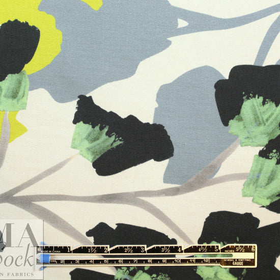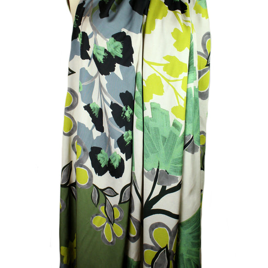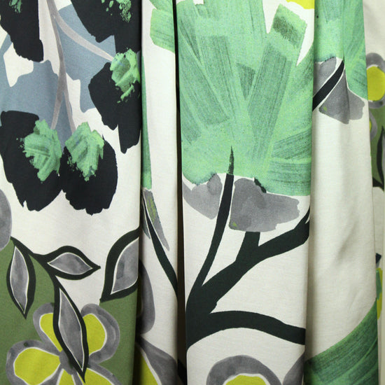 This is a stunning quality Italian satin finish viscose challis, lightweight and opaque with a soft hand and drape. The 'springtime fantasy' design (52.5" repeat ---just under 1.5 yards) is sprawling and dramatic, and could be treated as a panel print (we just sell it by the yard, because there's no clear delineation between the repeats of the design). It features shades of sulpher green, very dark pine, spearmint, gray, slate, ecru, etc. (PANTONE 13-0530, 19-5212, 14-4206, 15-6114, etc.). Make a tunic, blouse, shirt, top, dress, etc. Please test first if you wish to hand wash, and hang to dry, or dry clean.