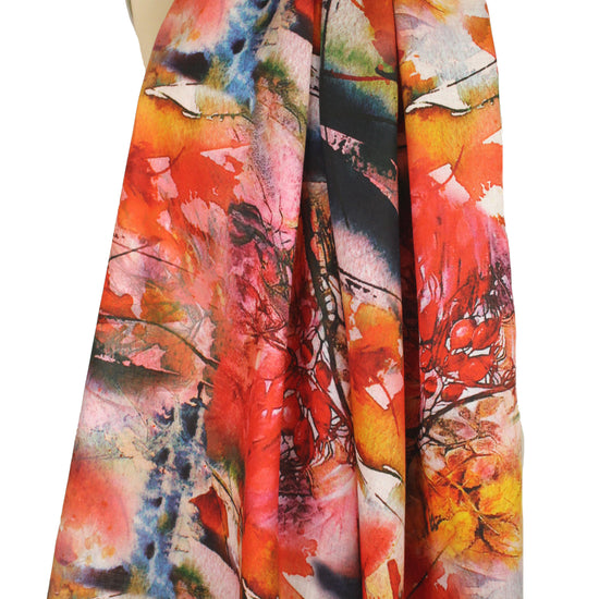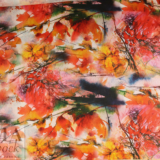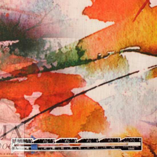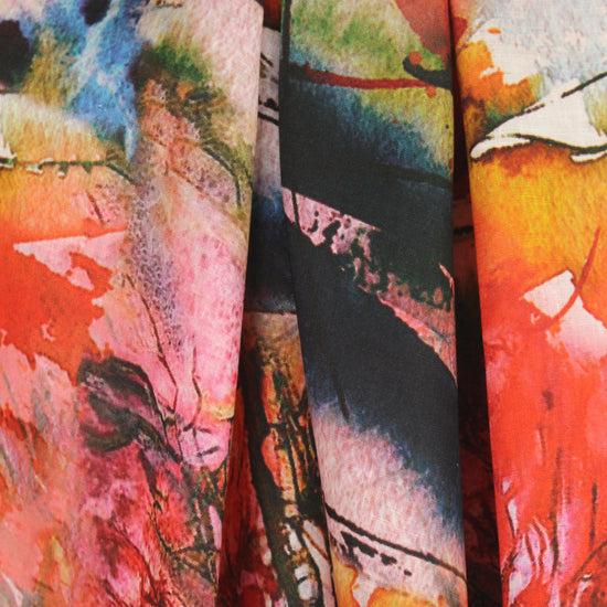 This is an exquisite digitally printed "arbora abstract" design on a medium-light weight linen that has lovely drape with body. This gorgeous print features a variety of glorious colors including orange spice, gold, indigo, red, reddish browns, etc. (PANTONE 18-1561, 14-1036, 18-4141, 16-1257, etc). Absolutely stunning as are all of the digital linen prints! The weight is very versatile, and you can easily cut in either direction or on the bias to suit your taste and vision. Suitable for a skirt, dress, shirt, tunic, etc. Dry cleaning recommended by the manufacturer, but we've put many of these linen prints in the washer and dryer and they came out just fine. 1.25 yds.