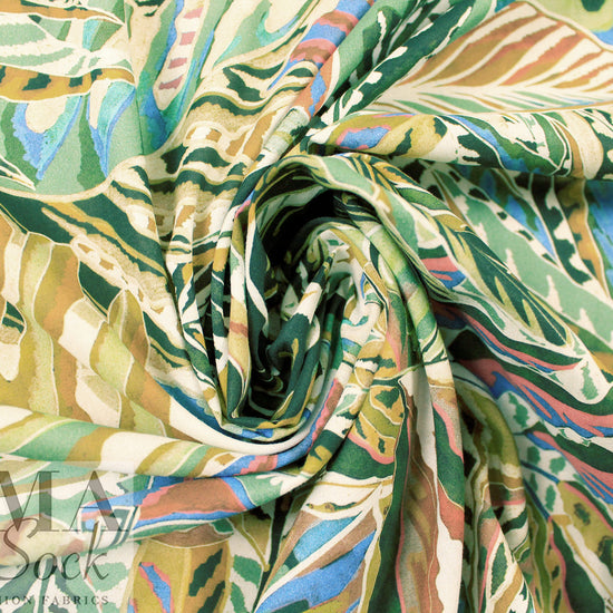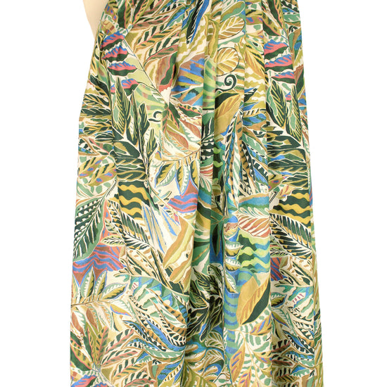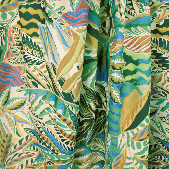 From Italy, this is an absolutely beautiful cotton voile, lightweight, smooth and semi-opaque with a floaty, cottony drape. The wonderful "verdant leaves" design (24" repeat) is printed in olive, blue sage, lake blue, burnt orange, off-white, etc. (PANTONE 17-0836, 16-5907, 17-4030, 16-1148, etc.). It is perfect for a blouse, top, tunic, etc. Lining may be needed for some styles. Hand wash and hang to dry (please test first), or dry clean. 1.125 yds.