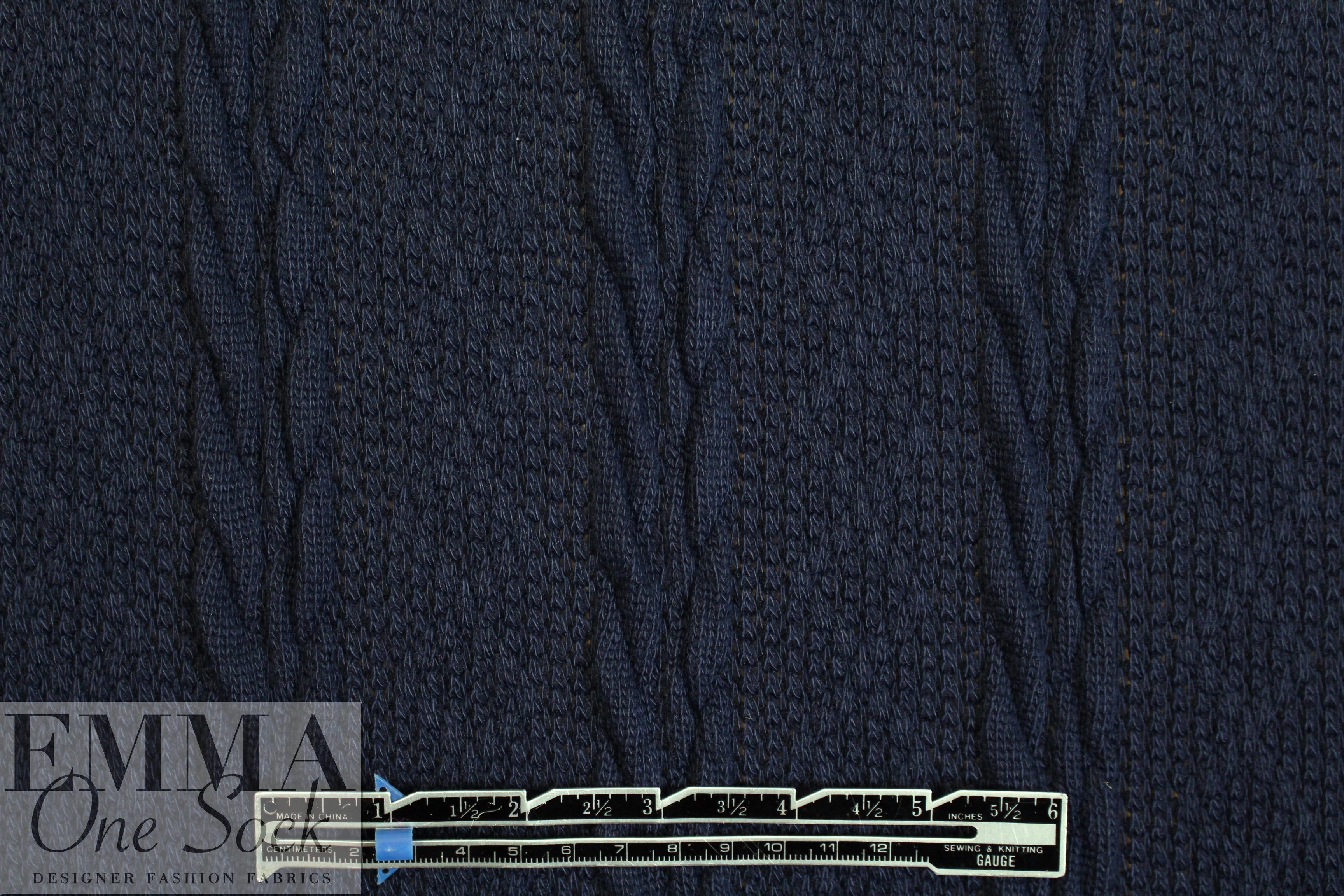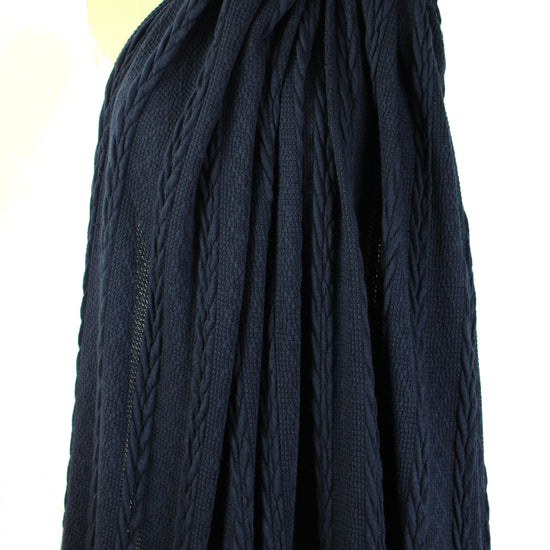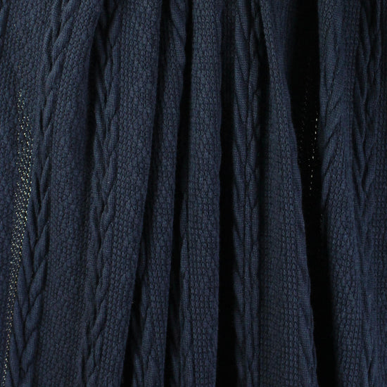 This cable sweater knit is classic, beautiful and easy care! The color is india ink a dark marine blue (PANTONE 19-4019). It is a medium-light weight sweater knit with a soft drape, and lots of dimension and texture. With about 80% widthwise stretch, it has great springback due to rows of black elastic yarns woven through the back of the knit. The cables run lengthwise and the horizontal repeat is 2.875". This beauty is perfect for cardigans, pullovers, a tunic, scarf, etc. The knit is very slightly open in some areas so some styles may need lining or layering. Machine wash in cool water, gentle cycle, lay flat to dry (please test first). .875 yds.