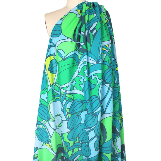 From Italy, this is an absolutely beautiful cotton voile, lightweight, smooth and semi-opaque with a floaty, cottony drape. The wonderful "reaching blossoms" design (31.75" repeat) is printed in light sky, soft gray, blue sapphire, holly, grass, limoncello, etc. (PANTONE 14-4210, 18-4231, 16-5932, 15-6340, 13-0550, etc.). It is perfect for a blouse, top, tunic, kaftan, etc. Lining may be needed for some styles. Hand wash and hang to dry (please test first), or dry clean. 1.75 yds.