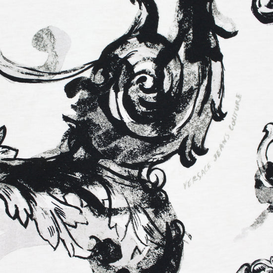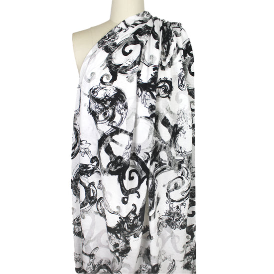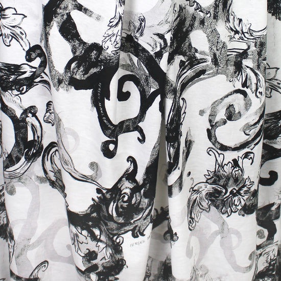Made for the very famous designer, this is a wonderful deadstock cotton knit, light weight and semi-opaque with a soft, cottony hand and drape. It has a tiny, plain knit stitch, and the "Ver$ace scroll" design (19.5" repeat) is printed in black and light charcoal gray on a white background (PANTONE 16-0000, etc.). With just 10% widthwise stretch, this is a very stable knit fabric. Perfect for an upscale tee, top, tunic, etc. Test first if you wish to hand or machine wash, and hang to dry. 1.25 yds.