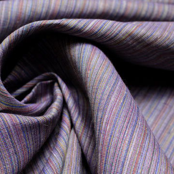 This is a beautiful quality European linen in a vertical, narrow yarn-dyed stripe weave. It features wonderful shades of blue, muscat, wine, etc. (PANTONE 18-3513, 17-1522, 18-3920) and is perfect for spring/summer/fall. It is a semi-opaque dress weight woven with some crispness in the drape, suitable for an overshirt, dress, tunic, pants, skirt, airy summer separates, etc. Dry clean or test first if you want to try hand or machine washing. Lay flat or hang to dry.